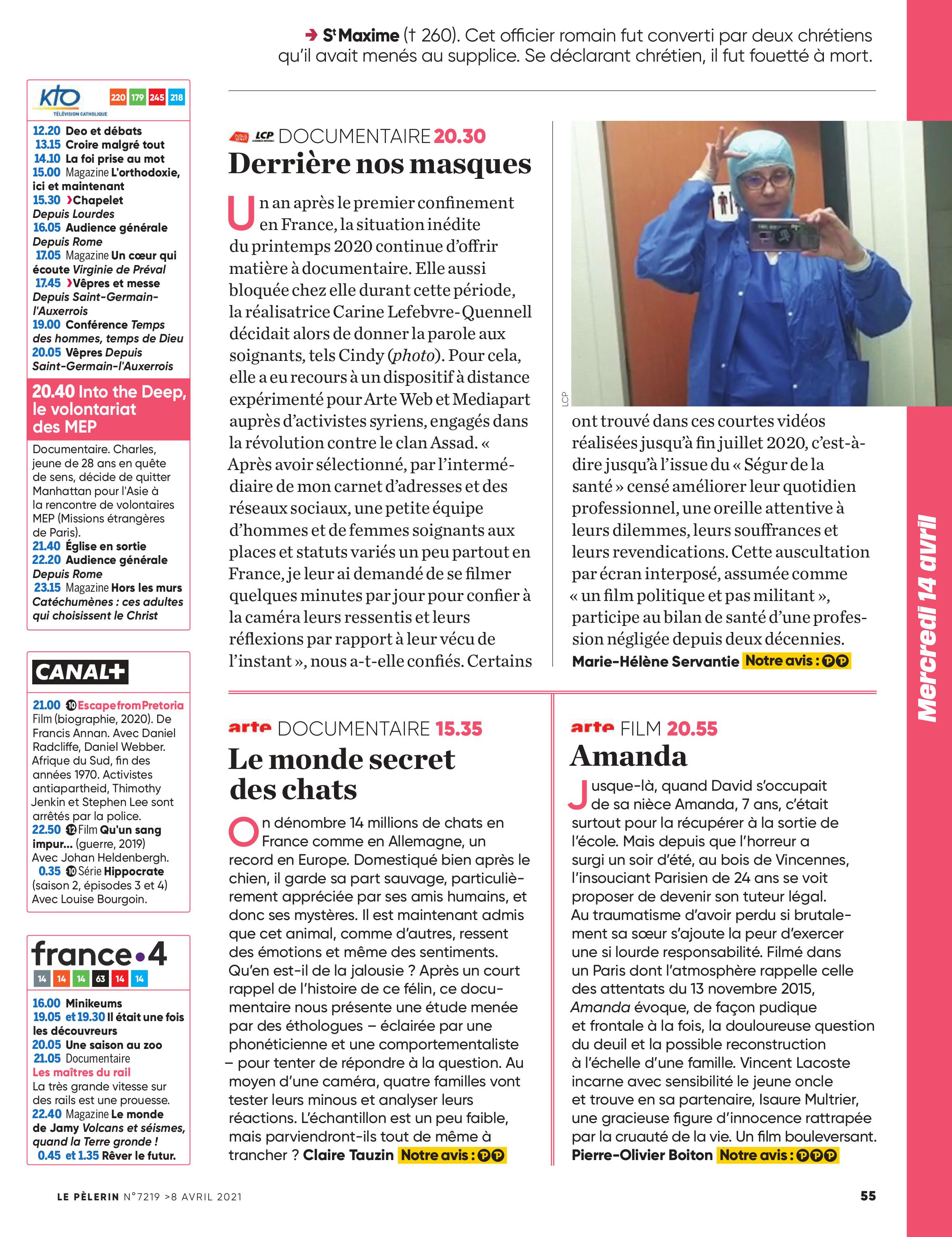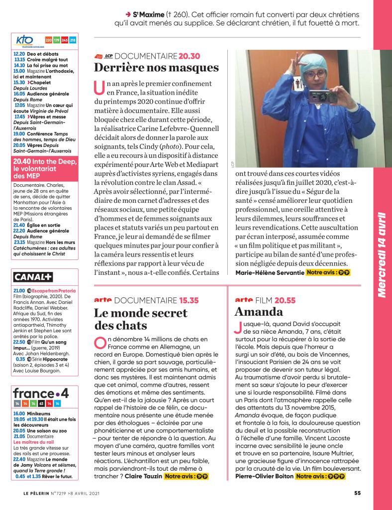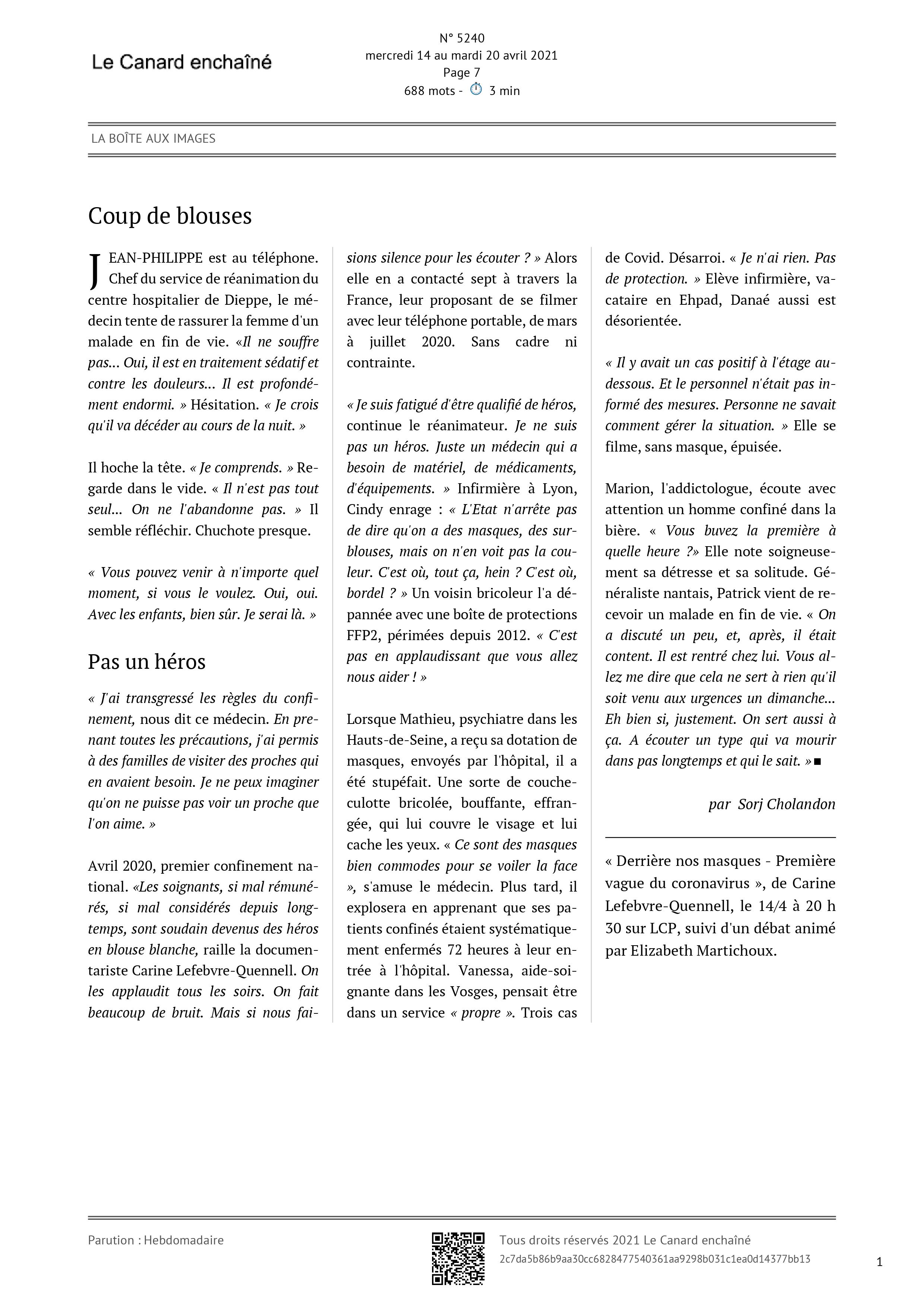 “Derrière nos masques” , film documentaire 60′- Lauréat de la bourse Brouillon d’un Rêve de la Scam– Production Temps Noir- Une coproduction LCP- AN, Rosa Normandie films – avec l’aide l’Adav- diffusé en avril 2021 –https://www.facebook.com/watch/?v=292497772444637
